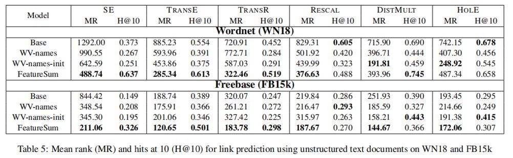 两个数据集的结果见表5。注意,这些结果不能直接与表2进行比较,因为这两组实验使用不同的文本数据。应该在同一个表中跨行进行比较。在这样做时,Wordnet上的平均秩通常表明,仅对实体名称应用WV已经给出了显著的改进,而使用word2vec向量初始化则进一步改进了结果,如[Socher等人,2013]所建议的。对于hits@10,结果是好坏参半的,WVnames方法在某些情况下显示出优势,而在其他情况下则显示出损失。