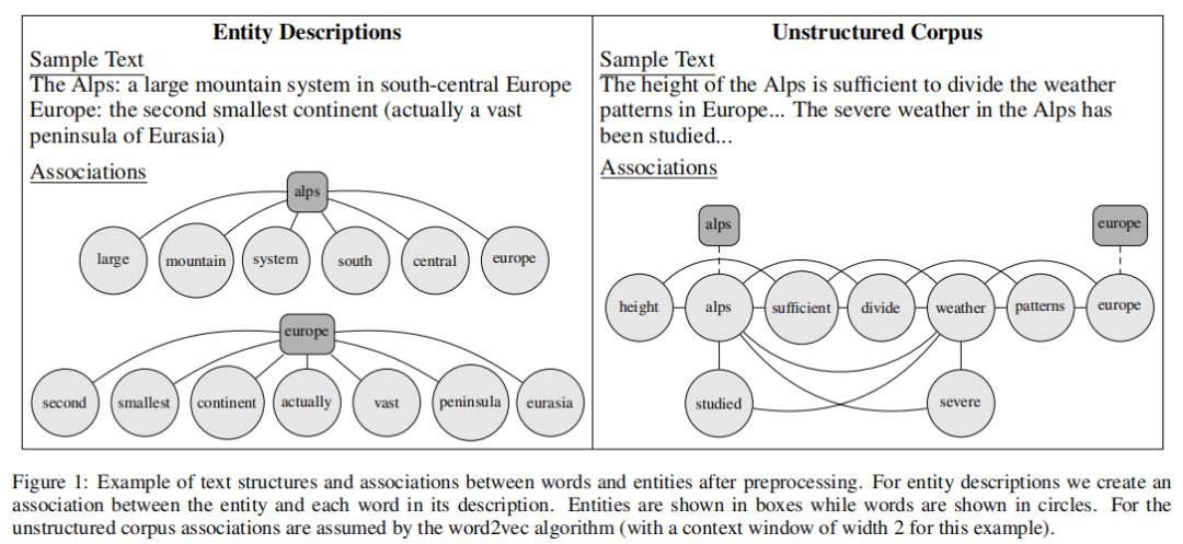 在本节中,我们考虑图1中的第二个场景。为了从非结构化数据中获取信息,我们在给定的语料库上训练word2vec模型[Mikolov等人,2013],以学习单词的嵌入向量。Word2vec被训练为将相似的向量分配给通常出现在相同上下文中的单词,这使得它非常适合学习实体向量。例如,句子片段布赖恩琼斯和他的吉他手基思理查兹开发了一个独特的。。。很清楚地说明了布赖恩·琼斯和基思·理查兹之间的关系。由于Brian Jones和Keith Richards在同一个上下文中以单词的形式出现,因此这些实体的word2vec向量将更类似于非结构化语料库的嵌入模型。