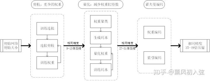 神经网络压缩一直是一个重要的研究方向,而目前业界最认可的压缩方法莫过于 ICLR 2016 的最佳论文 Deep Compression,算法流程如下图所示: