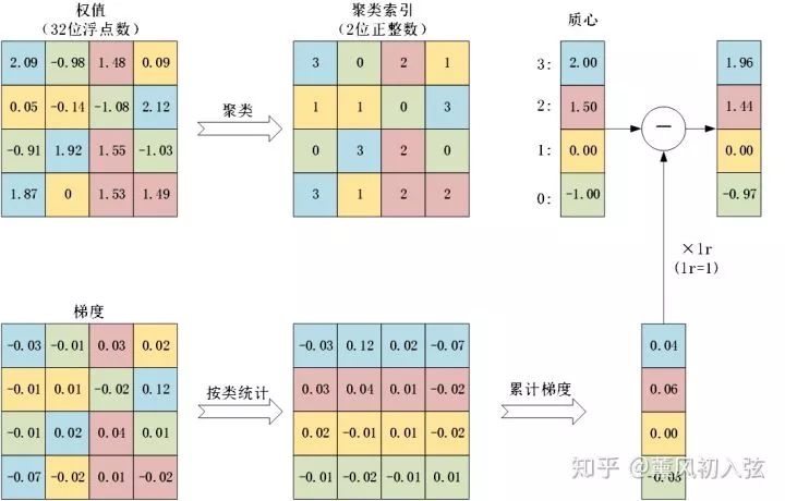 如上图所示,首先所有权重和正常的神经网络一样计算梯度。但由于剪枝的作用,矩阵实际上已经是稀疏矩阵,权值矩阵中为 0 则表示该连接被移除,因此这些位置的梯度被舍弃(置 0 )。而剪枝后,每一个权值对应的聚类结果(即对应码本中的权值)已经确定,在图中的聚类索引表示聚类的结果,同时该结果在权重和梯度图中以对应的颜色标注,例如权重中的 2.09(第一行第一列)和 2.12(第二行第四列)为同一类,量化之后他们的值也都是质心的值。