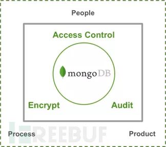 MongoDB端到端安全架构设计如下图所示,从人员、过程和产品(技术)三个维度进行纵深安全体系防护,分别通过访问控制、加密和审计来实施。