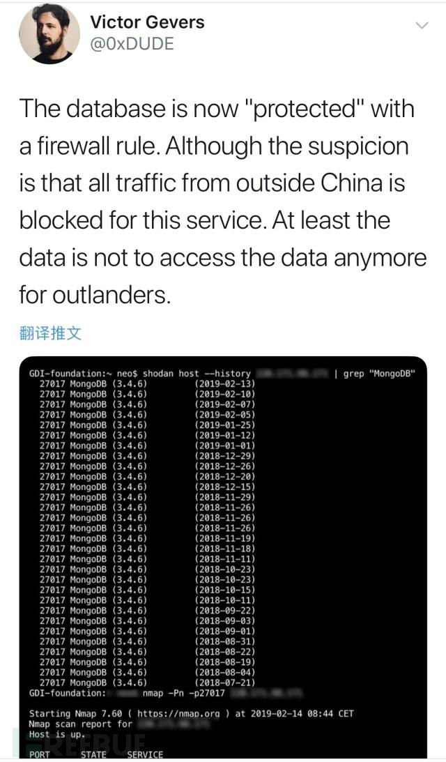 从Gevers在推特上发的截图和描述可以初步分析如下,该公司使用MongoDB数据库存放人脸识别等个人敏感数据,该数据库实例服务使用MongnDB安装缺省端口27017,该服务端口可由互联网直接访问,该数据库未启用身份认证机制,即允许任何人访问。