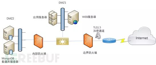 网络安全架构部署参照下图,通过两层防火墙将WEB/应用服务器和MongoDB数据库服务器分别隔离在不同的两个DMZ类进行网络区域隔离和分层网络访问控制,数据库服务器通过防火墙访问规则控制只能由DMZ1区域内的应用服务器访问,避免了将其直接暴露给互联网的安全风险问题。