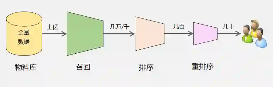 推荐系统本质上就是一个信息过滤系统,通常分为:召回、排序、重排序这3个环节,每个环节逐层过滤,最终从海量的物料库中筛选出几十个用户可能感兴趣的物品推荐给用户。