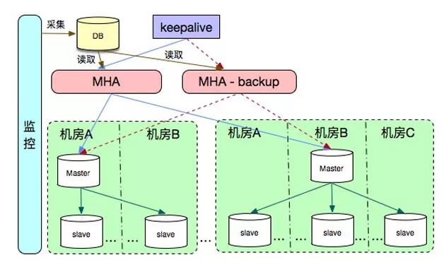 在MHA自身的高可用上,我们也是基于KeepAlive做了高可用的方案,保证MHA的可用性。