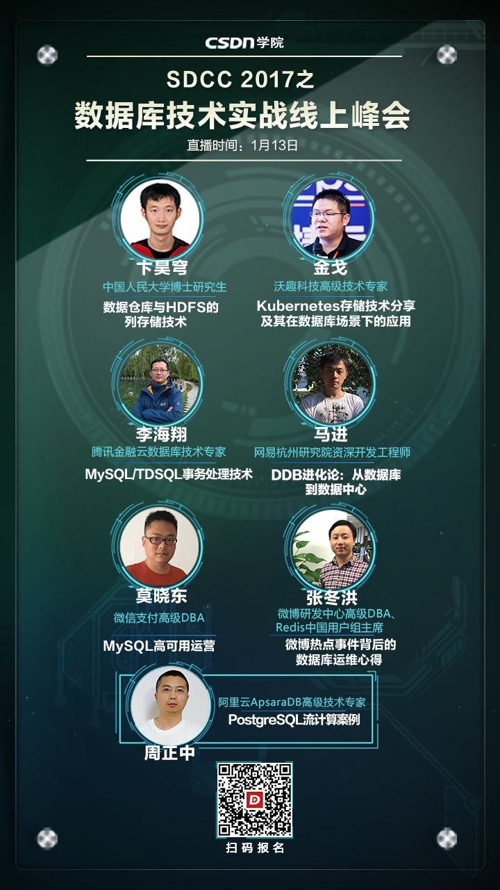 1月13日,SDCC 2017之数据库线上峰会即将强势来袭,秉承干货实料(案例)的内容原则,邀请了来自阿里巴巴、腾讯、微博、网易等多家企业的数据库专家及高校研究学者,围绕Oracle、MySQL、PostgreSQL、Redis等热点数据库技术展开,从核心技术的深挖到高可用实践的剖析,打造精华压缩式分享,举一反三,思辨互搏,报名及更多详情可扫描下方二维码或点击「阅读原文」查看。