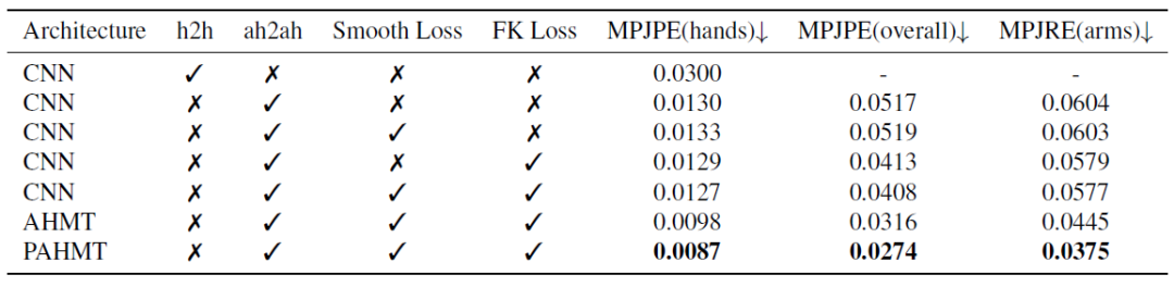 下表展示了消融实验的结果。结果显示,通过利用帧间相关性信息,普通Temporal Transformer表现出显著优于CNN的性能。而通过引入Spatial Transformer来利用手臂姿态和手势姿态之间的全局相关性以及不同关节点之间的局部相关性之后,实验误差继续显著降低(MPJPE降低13%,MPJRE降低16%)。对于目标函数,可以看出单独引入FK loss能够降低实验误差,而单独引入帧间平滑损失则于误差降低无益,这是因为帧间平滑损失的主要目标是提高输出的帧间连续性。但值得注意的是,当FK loss和帧间平滑损失结合使用时,实验误差比单独使用任意一种都更低。综上所述,实验验证了论文提出的并行时空transformer结构以及目标函数的有效性。