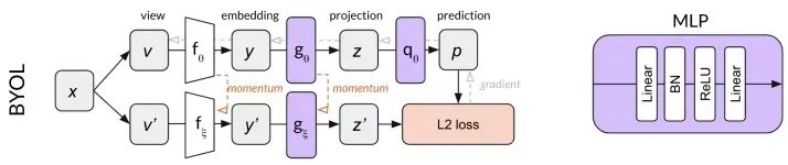 上面的分支是 online network,包括了 embedding,projection 以及 prediction,其中嵌入的使我们最要想要的模块。