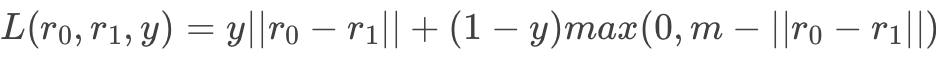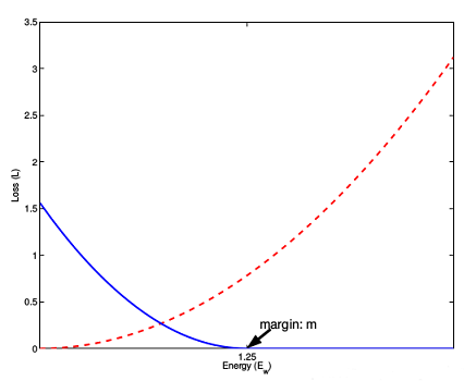 上图是 loss 与样本特征的欧式距离 d 之间的关系,其中红色虚线表示的是相似样本的损失值,蓝色实线表示的不相似样本的损失值。