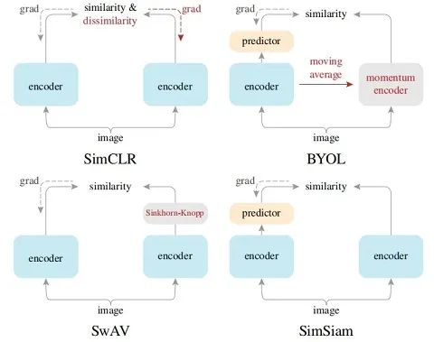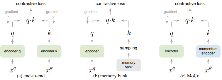 end-to-end:先编码 encoder(可同可不同),然后内积算 loss 再梯度。但是这种方法由于 dictionary size 和 mini-batch 的强耦合性(负例样本对也会为 loss 产生贡献,也会回传梯度),在 batch 大的时候优化难,而在 batch 小的时候,batch 之间的参数会不一样,也就是 GPU 大小限制了模型的性能。