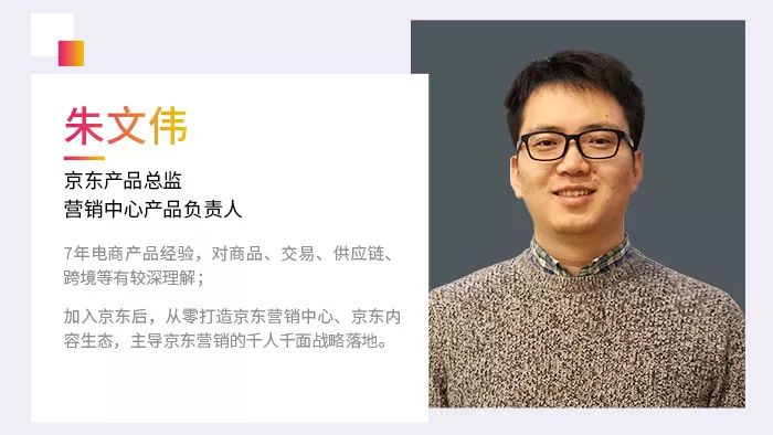 拥有多年电商产品经验,从零打造京东营销中心、京东内容生态,主导京东营销的千人千面战略落地的京东产品总监余文伟;