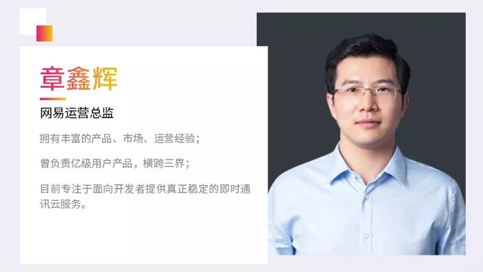 第二位,是拥有丰富的产品、市场、运营经验;曾负责亿级用户产品,横跨三界,目前专注于面向开发者提供真正稳定的即时通讯云服务的网易运营总监章鑫辉。