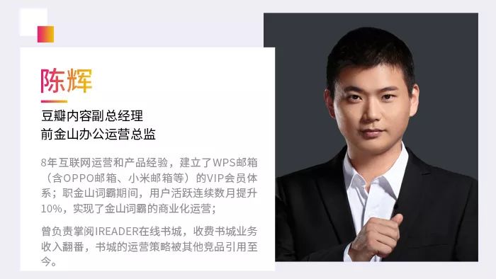 拥有多年互联网运营和产品经验,曾将张月收费书城业务翻番的豆瓣内容副总经理陈辉;