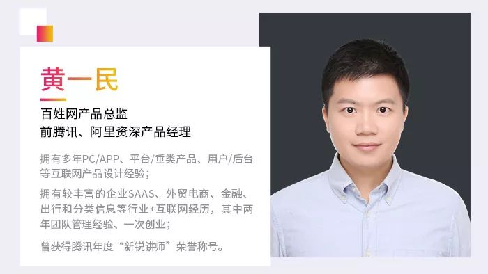 拥有多年PC/APP、平台/垂类产品经验,拥有较丰富的企业SAAS、外贸电商、金融、出行和分类信息等行业+互联网经历的百姓网产品总监黄一民;