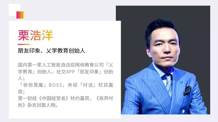 第一位,是国内第一家人工智能自适应网络教育公司「乂学教育」创始人、社交APP「朋友印象」创始人栗浩洋。