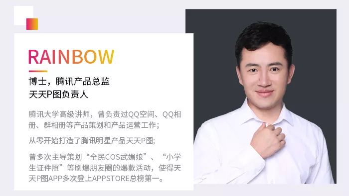 多次主导策划了“全民COS武媚娘”、“小学生证件照”等刷爆朋友圈的爆款活动、腾讯明星产品天天P图的负责人Rainbow;