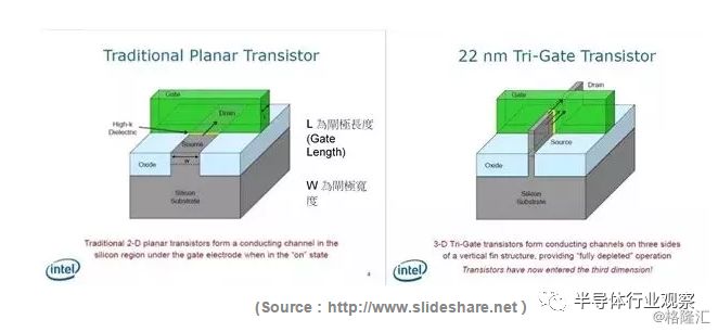 不过,制程并不能无限制的缩小,当我们将电晶体缩小到 20 纳米左右时,就会遇到量子物理中的问题,让电晶体有漏电的现象,抵销缩小 L 时获得的效益。作为改善方式,就是导入 FinFET(Tri-Gate)这个概念,如右上图。在 Intel 以前所做的解释中,可以知道藉由导入这个技术,能减少因物理现象所导致的漏电现象。