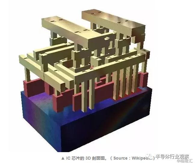 从上图中 IC 芯片的 3D 剖面图来看,底部深蓝色的部分就是上一篇介绍的晶圆,从这张图可以更明确的知道,晶圆基板在芯片中扮演的角色是何等重要。至于红色以及土黄色的部分,则是于 IC 制作时要完成的地方。