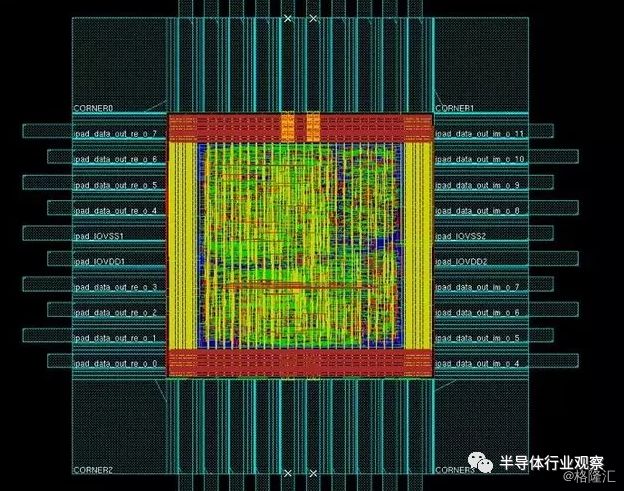 最后,将合成完的程式码再放入另一套 EDA tool,进行电路布局与绕线(Place And Route)。在经过不断的检测后,便会形成如下的电路图。图中可以看到蓝、红、绿、黄等不同颜色,每种不同的颜色就代表着一张光罩。至于光罩究竟要如何运用呢?