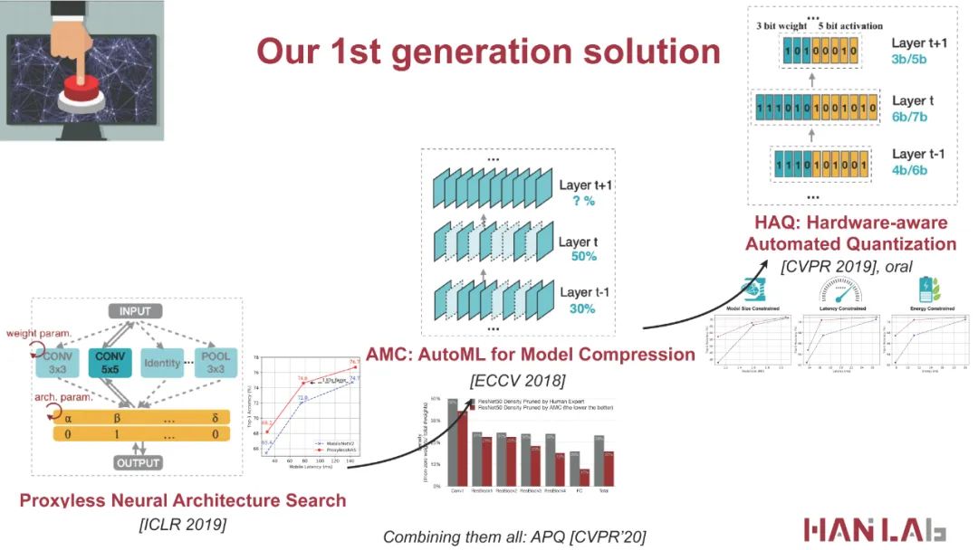 韩松 本科毕业于清华大学,博士毕业于斯坦福大学,师从 NVIDIA 首席科学家 Bill Dally 教授。他的研究也广泛涉足深度学习和计算机体系结构,他提出的 Deep Compression 模型压缩技术曾获得 ICLR'16 最佳论文,ESE 稀疏神经网络推理引擎获得 FPGA'17 最佳论文,对AI算法在移动端的高效部署影响深远。他的研究成果在 Xilinx、NVIDIA、Facebook、Samsung 得到广泛应用。韩松在博士期间与同为清华大学毕业的汪玉、姚颂联合创立了深鉴科技(DeePhi Tech),其核心技术之一为神经网络压缩算法,随后深鉴科技被美国半导体公司赛灵思收购。2018 年,韩松加入MIT担任助理教授,入选2019年度麻省理工科技评论35 Innovators under 35,并在2020年获得NSF CAREER Award。