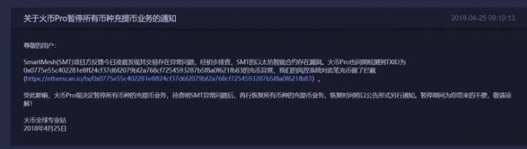 据火币 Pro 公告,SmartMesh(SMT) 项目方反馈 4 月 25 日凌晨发现其交易存在异常问题,经初步排查,SMT 的以太坊智能合约存在漏洞。受此影响,火币 Pro 目前暂停所有币种的充提币业务。
