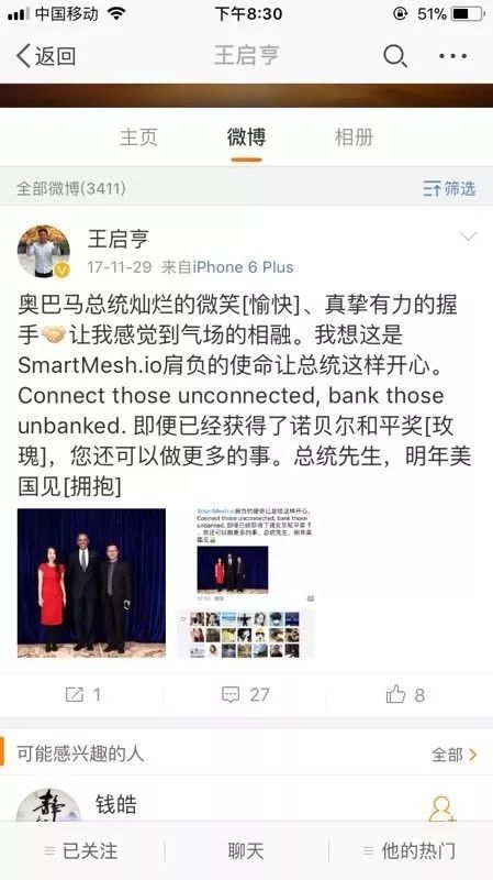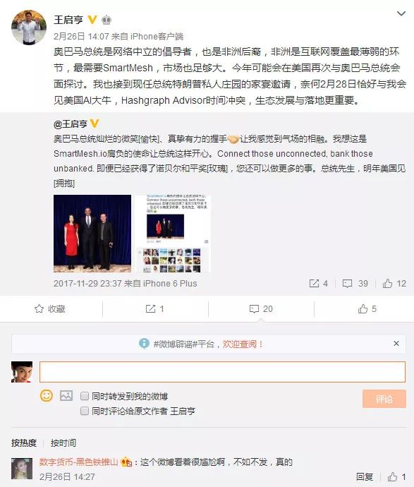 为了更加深入的了解这家公司,宅宅开始转阵微博,翻创始人王启亨的微博,同样没有令我“失望”,料也不少,先是晒与奥巴马的合照被网友怼。