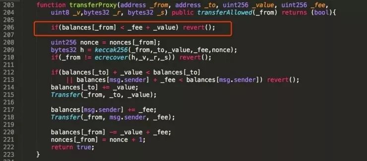 _fee 和 _value_ 这两个输入参数都能被攻击者控制,如果 _fee + _value 的结果正好为 0(也就是溢出的情况),第206行的检查将会失效。