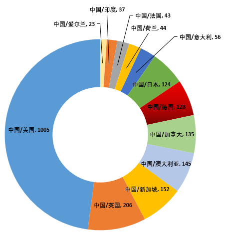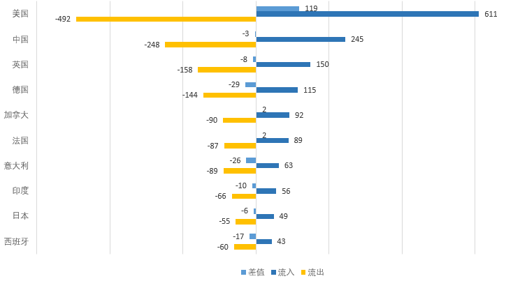 2009年—2020年间,美国、加拿大、法国的学者流入数量大于流出数量,而中国、英国、德国、意大利、印度、日本、西班牙的学者流出数量大于流入数量。无论是学者流入还是学者流出,美国排名第一,其次是中国。