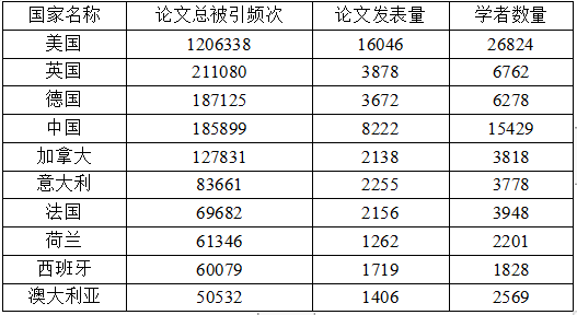论文总被引频次最高的国家是美国,其次是英国和德国等欧洲国家,中国排名全球第 4。相比英国和德国,中国的学者数量和论文发表量较高,但是论文总被引频次偏低。