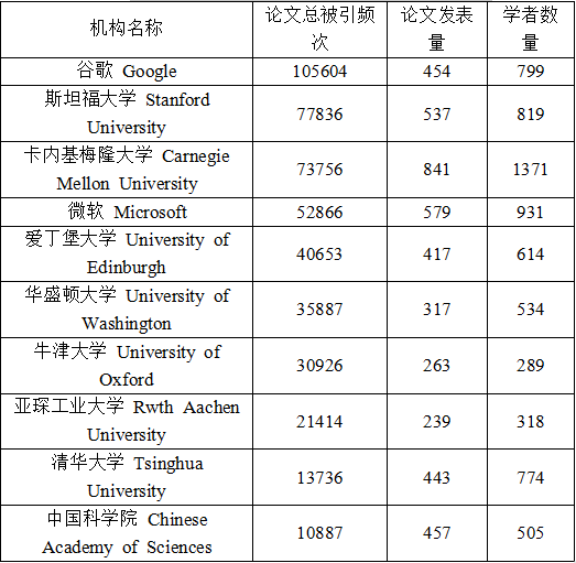 论文总被引频次排名前 10 的全球机构中,仅有清华大学和中国科学院入榜。这两个机构的论文发表量和学者数量排名前列,但是论文总被引频次位居榜尾。