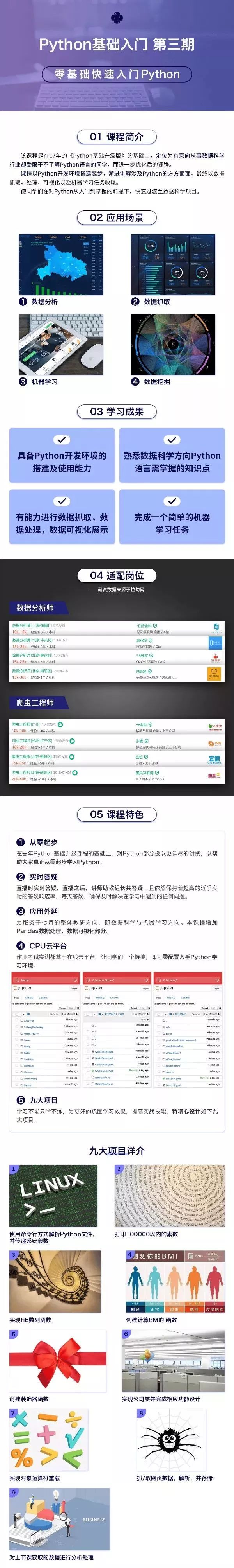 现在,有这样的一门课《Python基础入门 第三期》,一门真正的从零学Python课,带你快速入门Python。四大应用场景,五大课程特色,九大实战项目,更好的学习Python。
