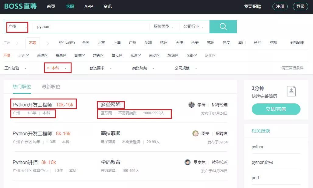 在招聘网站上直接以”本科生”和”Java”或”Python”作为筛选条件,以广州为例: