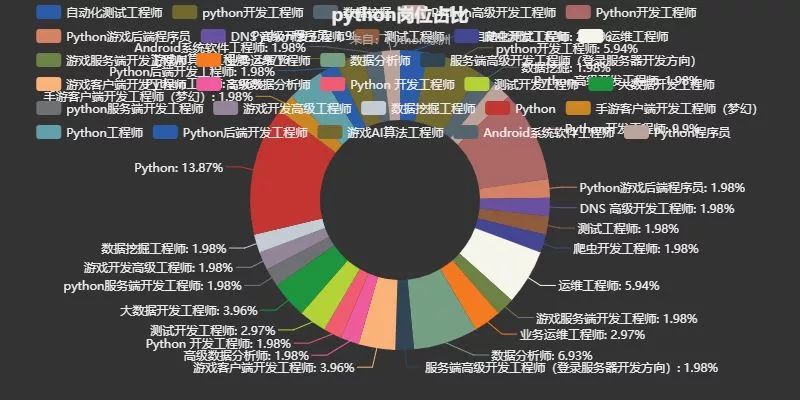 占比前五位分别是:Python工程师、数据分析师、运维工程师、大数据开发工程师和游戏AI算法工程师。