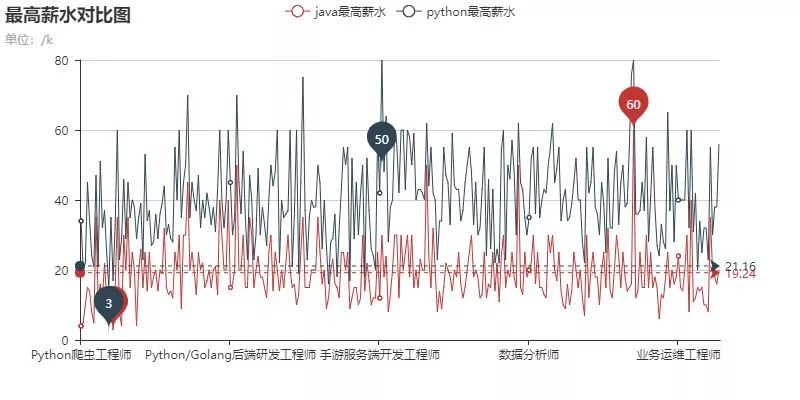 看来Python的地位不是吹的,最高薪水也大多数都比Java的高。Java最高薪水平平均为19.24K,最低3K,最高60K;Python最高薪水平均为21.16K,最低也是3K,最高50K,比Java稍低一点。