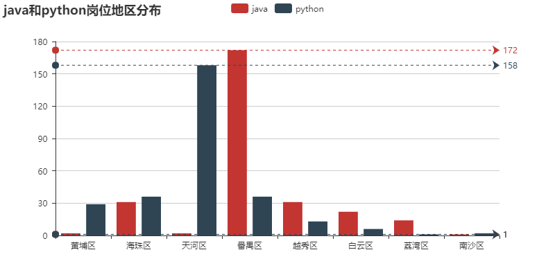 不难看出,越靠近城市中心的地区,招聘的岗位就越多,成功应聘的机会较高;番禺和天河区相差较大,其中天河区招的Python比Java将近多了8倍;番禺区Java比Python更加热门,受公司青睐;其他区相差不大。