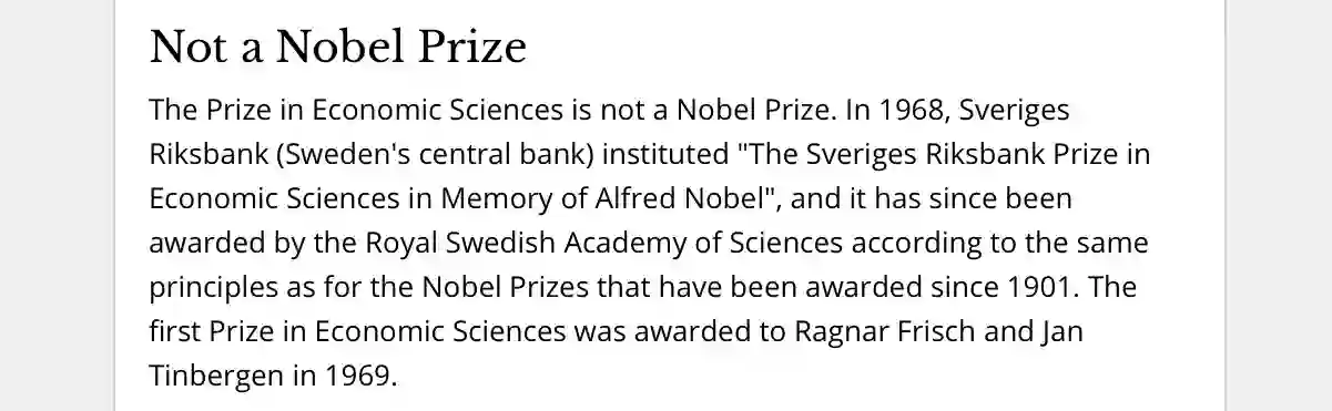 只不过,在诺奖的网站上,可以赫然看到几个大字:“Not a Nobel Prize”——你不是我亲儿子。