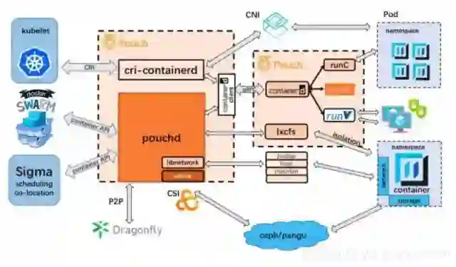 Pouch 的生态架构可以从两个方面来看:第一,如何对接容器编排系统;第二,如何加强容器运行时。