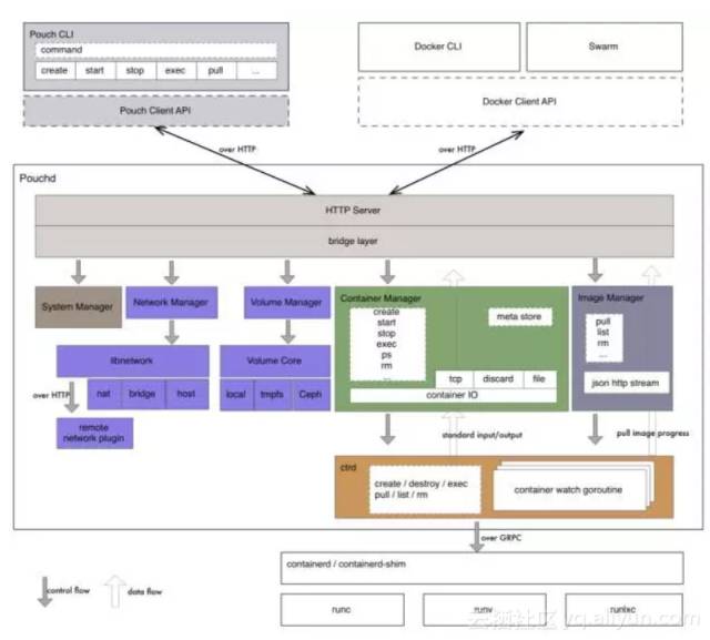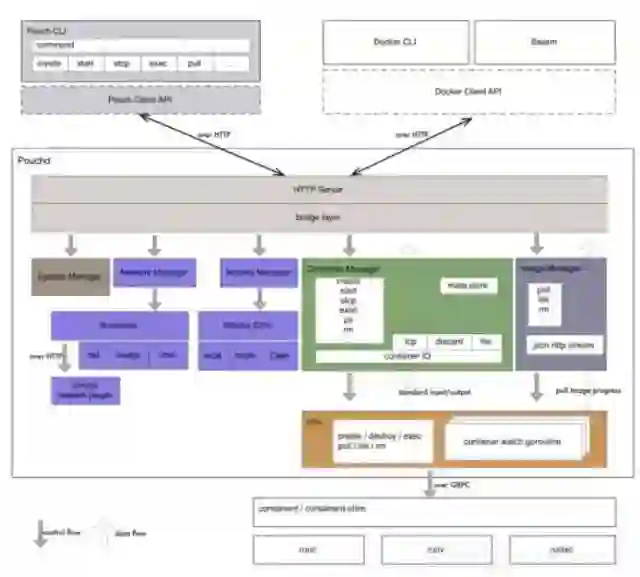 Pouch 对接生态的架构如下,而 Pouch 内部自身的架构可参考下图: