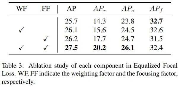 对于focusing factor,AP从25.7%提高到26.2%的AP。同时,在罕见类别上有显著提高,AP提高了3.4%,说明其在缓解严重的正负失衡问题方面的有效性。