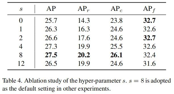这里研究了不同s值的影响,发现s=8的性能最好。如表4中可以看出,几乎所有的s≥0都可以提高改进后Baseline的性能。更重要的是,s可以在很大的范围内保持相对较高的性能。这表明EFL是超参数不敏感的。