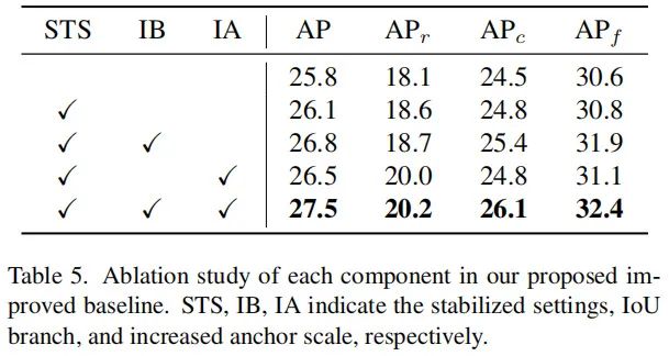 如Tab2所示,使用ResNet-50-FPN,本文提出的方法实现了总体27.5%的AP,将提出的改进Baseline提高了1.8%的AP,甚至在罕见类别上提高了5.9%。结果表明,EFL能够很好地处理稀有类的极正负失衡问题。