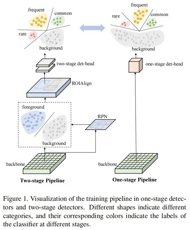 与包含区域建议网络(RPN)的两阶段方法,在将建议提供给最终的分类器之前过滤掉大多数背景样本相比,一阶段检测器直接检测规则的、密集的候选位置集上的目标。如图1所示,由于密集的预测模式,在一阶段检测器中引入了极端的前景-背景不平衡问题。结合长尾场景下的前景类别(即类别的前景样本)不平衡问题,严重损害了一阶段检测器的性能。