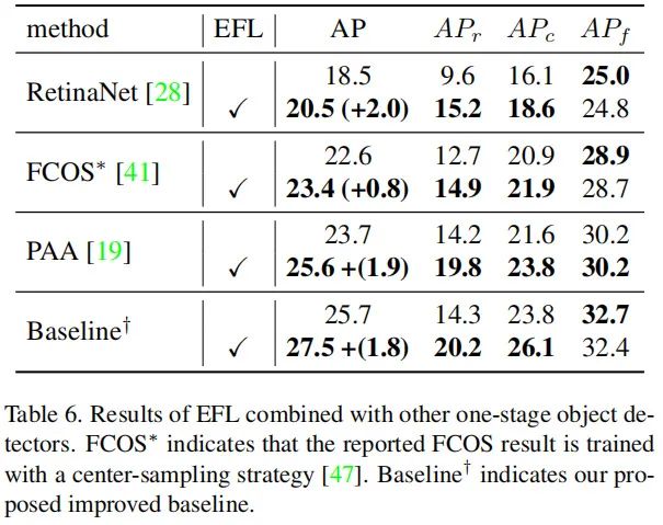 为了演示EFL在不同阶段检测器上的泛化能力,分别将其与RetinaNet、FCOS∗、PAA和改进的Baseline相结合。如表6所示,EFL在所有这些方法测试中都表现良好。与表1中的EQLv2和focal loss组合相比,提出的EFL相对于原检测器保持了稳定的较大性能提高(约+2% AP)。此外,EFL极大地提高了这些检测器在稀有类别上的性能,这表明在解决长尾分布问题方面的实力。