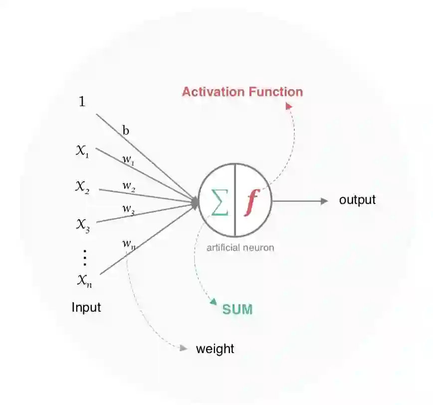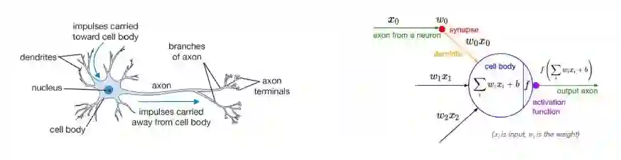 例如,下图中的概念解释很形象地展现了生物神经元和人工神经元工作方式的相似性。