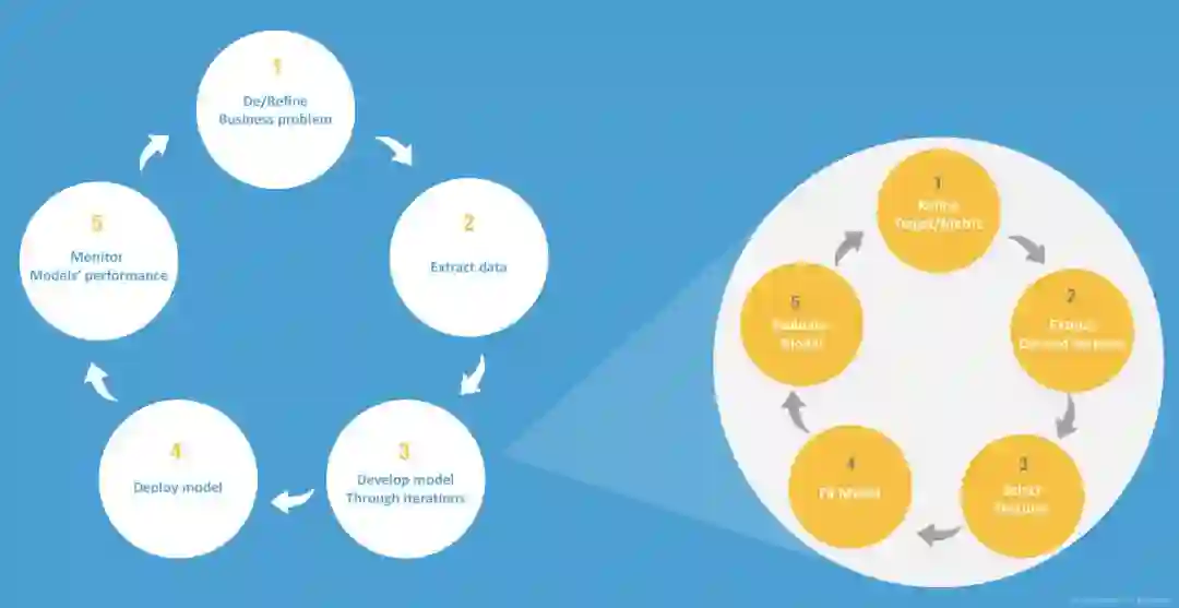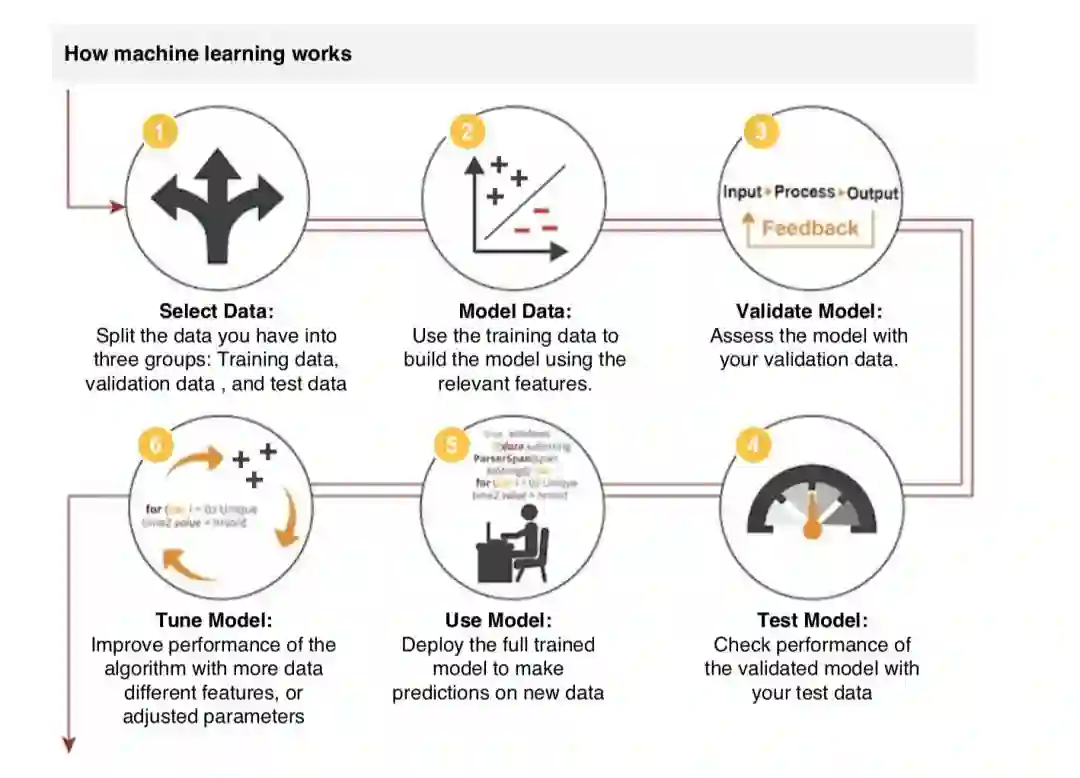 除了这些基础概念,这份教程也对机器学习模型的开发流程做了图像化展示(如下图),即使对此不太了解的读者,也能通过这种流程展示有所学习。