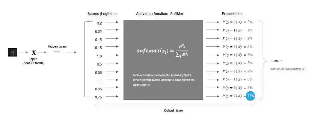 用神经网络分类手写数字的前向传播示例(softmax 激活函数)。