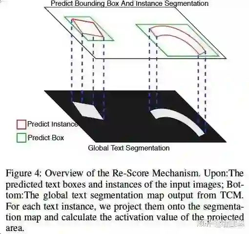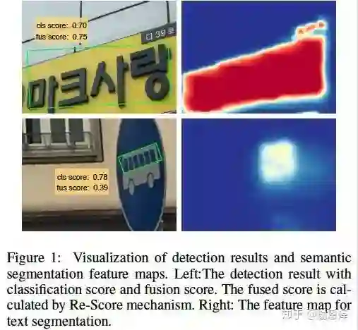为什么要引入Rescore?下图是 re-score 模块的可视化图。由图可知,Mask R-CNN 将水平box 的分类分数最终的 score,对于倾斜文本不是很友好,并且可能会引入 FP,我们在这里将语义分割图上的响应和原本的 score 融合起来,得到的 fus-score 可以缓解 Mask R-CNN 直接移植到文字检测上分类分数不准的问题。