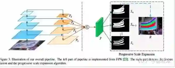 网络采用 FPN 结构,输入一张图片,网络会预测出带有不同尺度的 kernels 的分割结果,并通过渐进式扩展算法去重建文字区域。