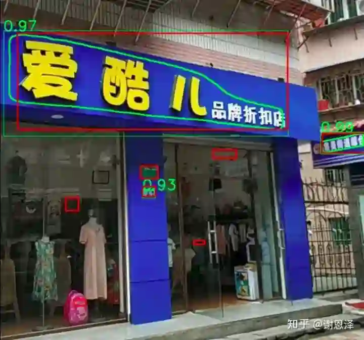 上图中的“爱酷儿”和“品牌折扣店”很容易检测成两个 box,但是采用我们的方法增大了模型的感受野之后就可以更好地解决这个问题,相比一些繁琐的后处理的方法也更加有效。