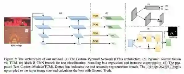 整个网络流程如下图所示,(a) 是 FPN 结构,(b) 是 text context(TCM)模块,(c) 是Mask R-CNN 的分支,(d) 是 TCM 具体的方法。